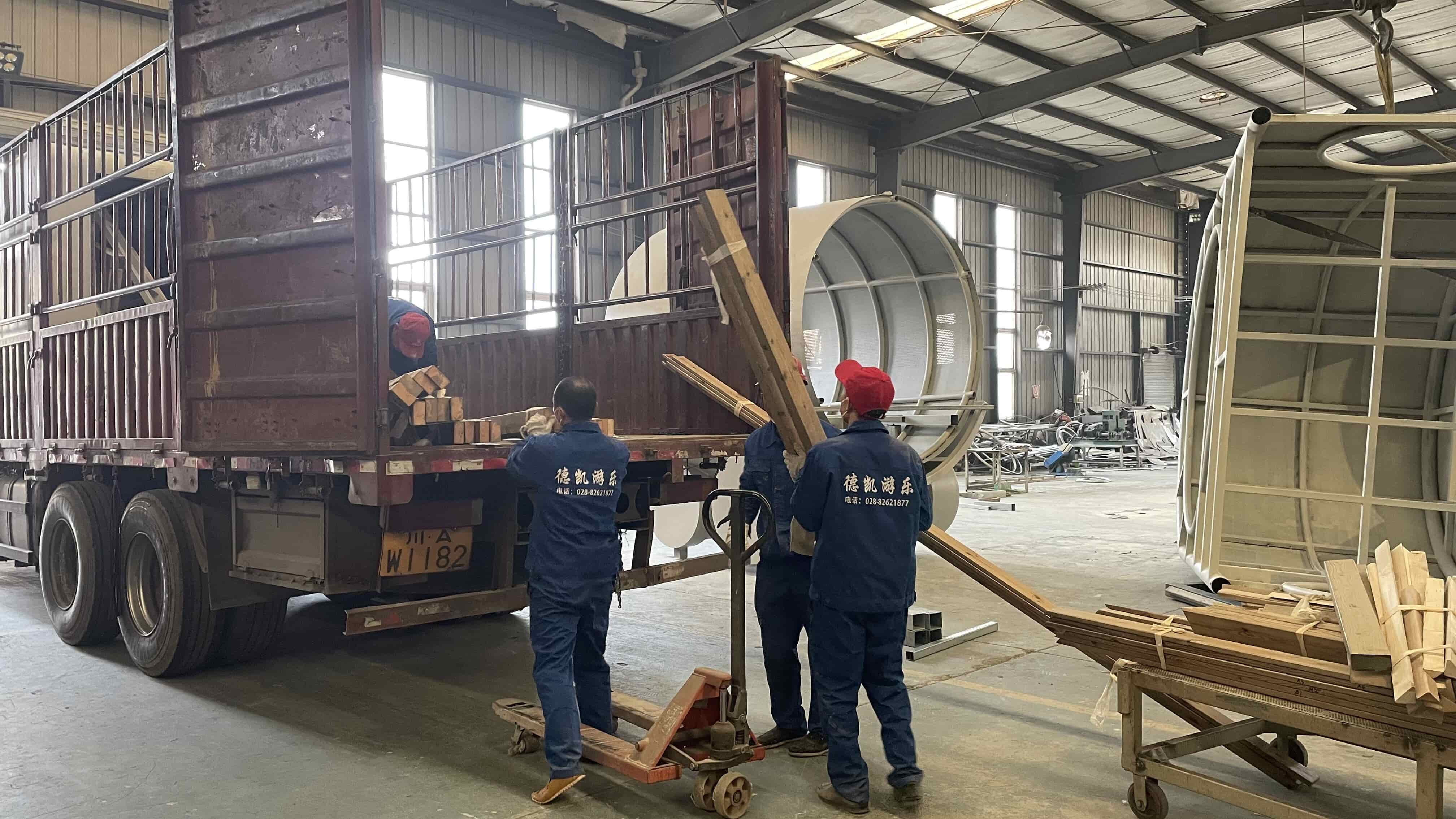 火山火車主題樂(lè)園部分設(shè)施開(kāi)始出庫(kù),運(yùn)輸?shù)侥康牡亻_(kāi)始安裝。