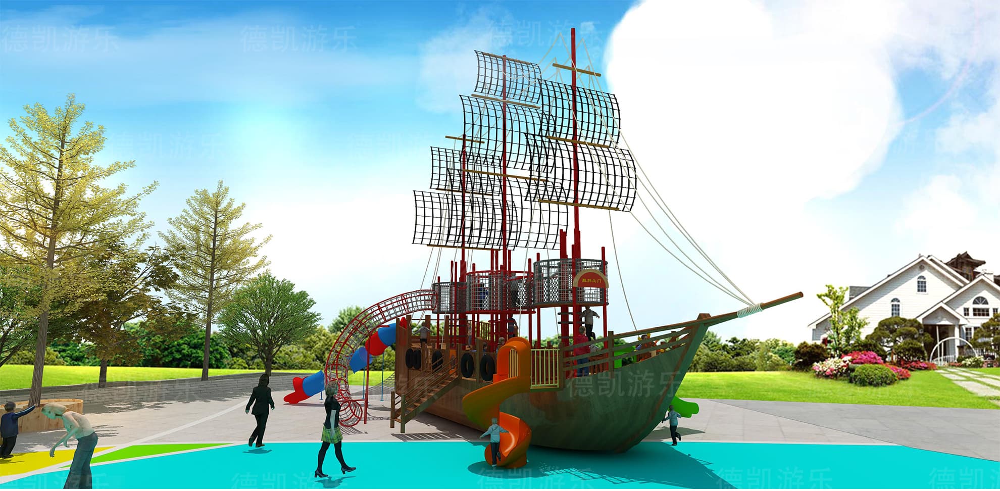 解析的是整個院子的主體設備:海盜船、秋千、異形爬網、蹦床、大鯨魚、探險鉆網、烽火臺鉆網、木制拓展組合。