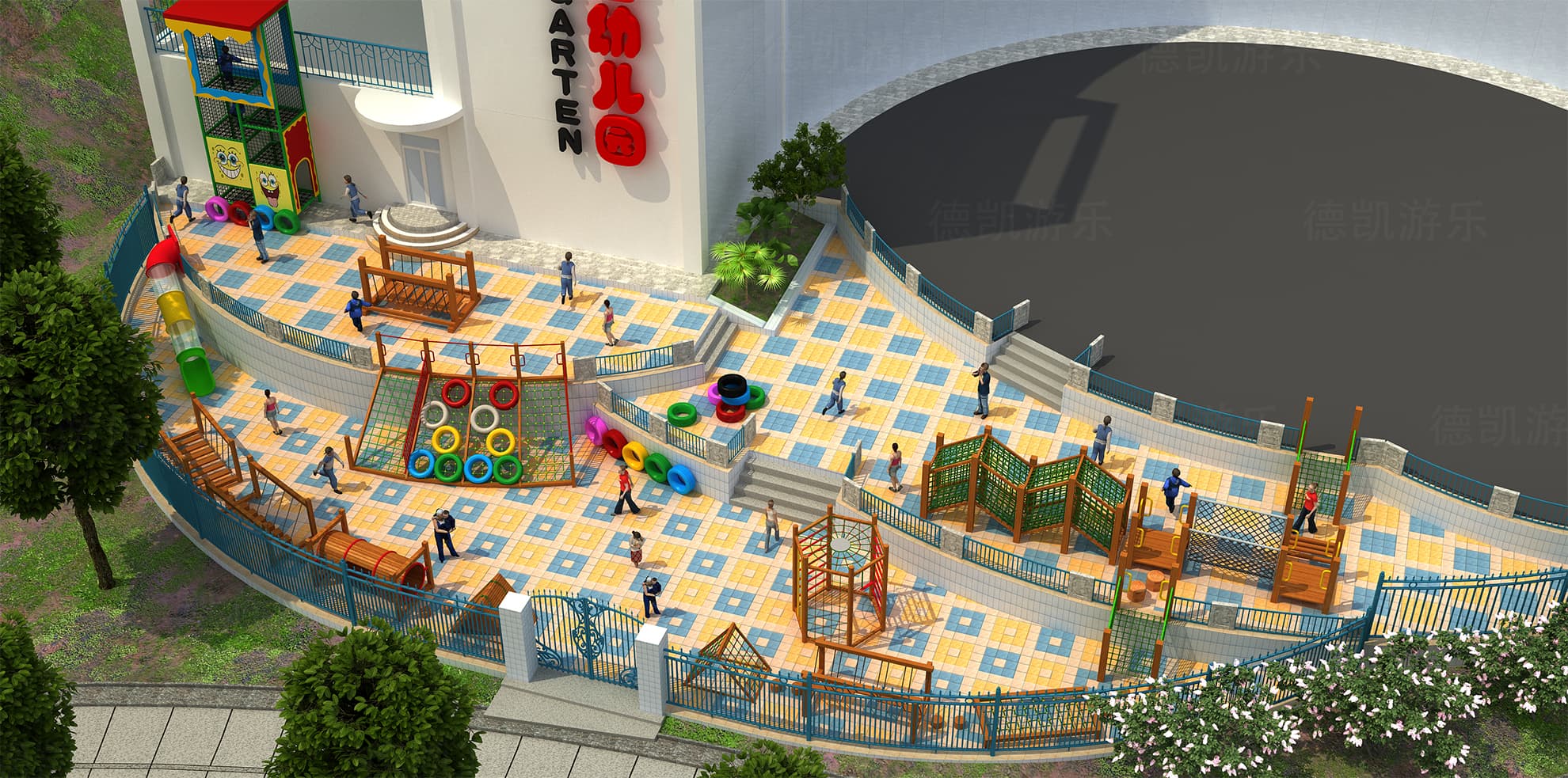 在俯視效果圖里面,我們可以看出整個園子的東西,木質拓展、爬網、滑桶、蕩橋等,一個個雅致的游樂設備點綴著單調的幼兒園。而且設備大部分的材料大部分都是木材,對于抵抗力弱的孩子們來說,健康、環保才不會對他們的身體健康造成負擔。就整體而言,設備比較簡單,挑戰難度不高,冒險性很低,很符合這個幼兒園的主要玩耍人群。